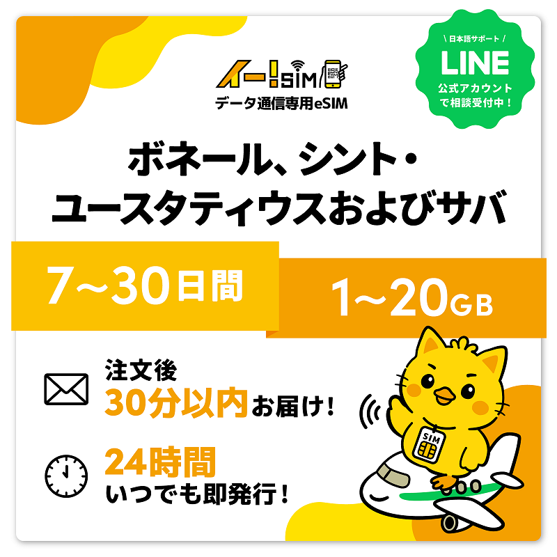 eSIM イー!SIM ボネール、シント・ユースタティウスおよびサバ 7日~30日間:1GB~20GB