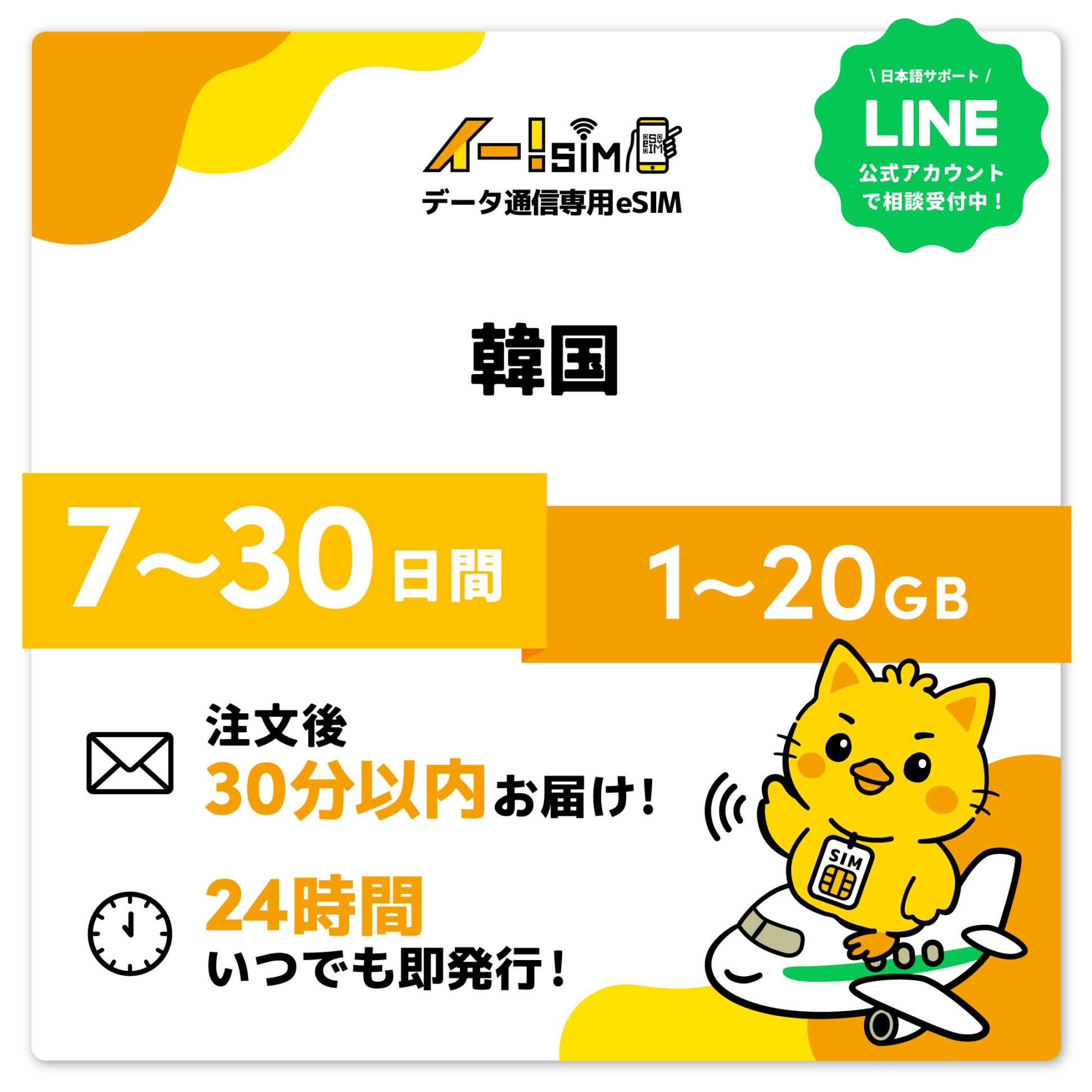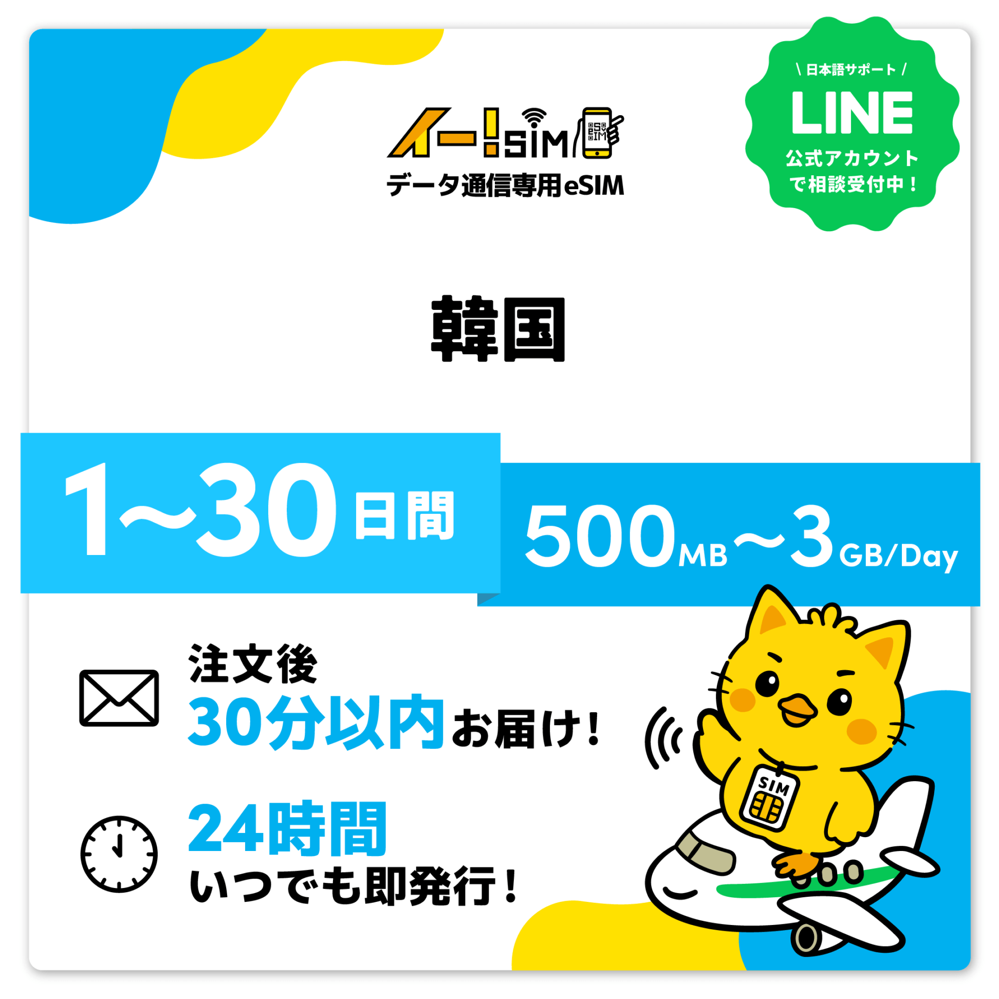 eSIM イー!SIM 韓国 1日~30日間:1日/500MB~3GB