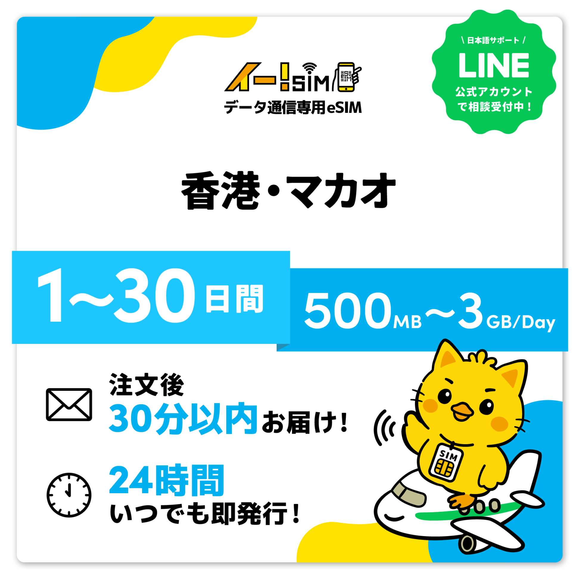 eSIM イー!SIM 香港、マカオ 1日~30日間:1日/500MB~3GB